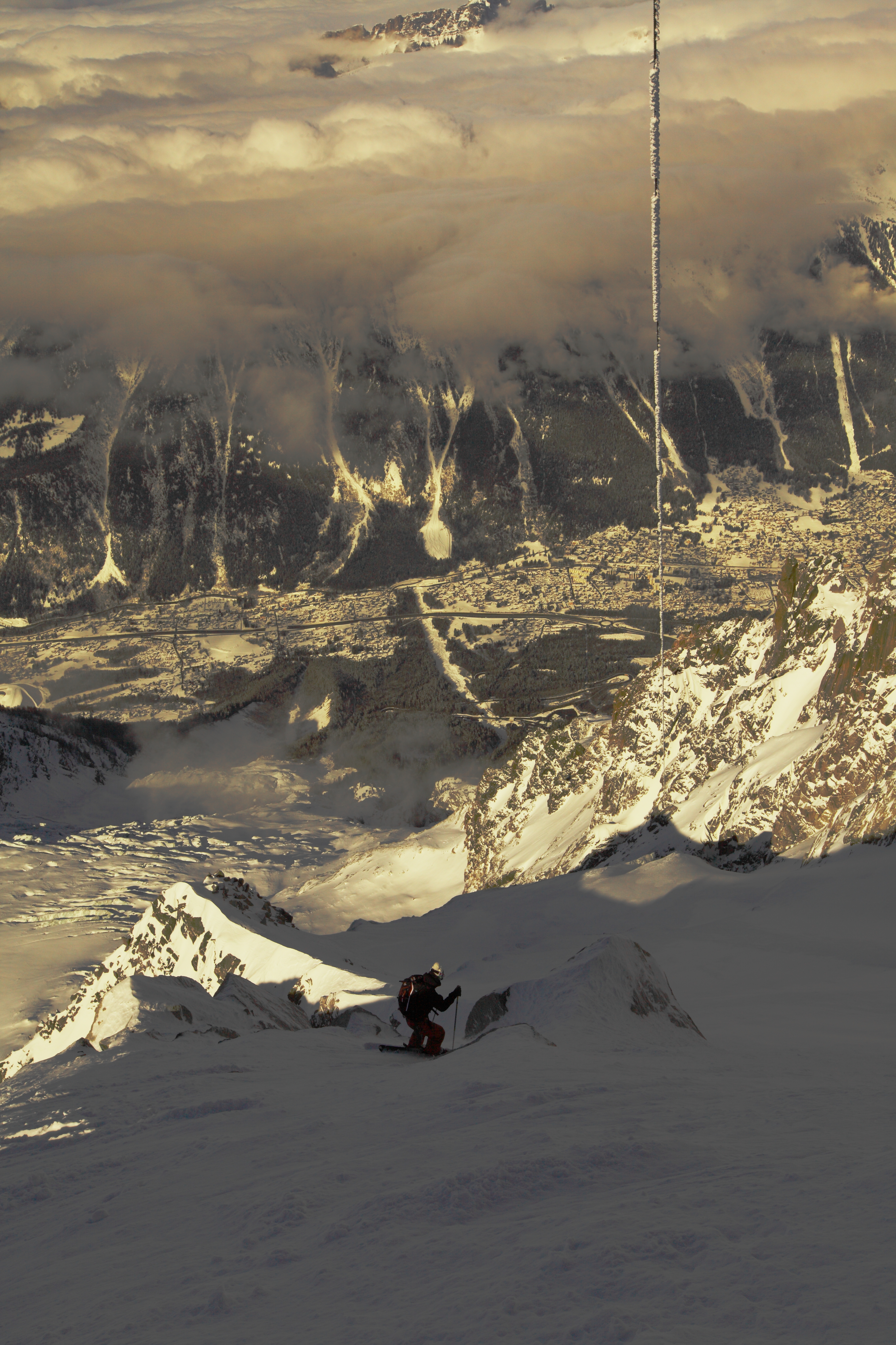 I am back at work. night shift .in the past 2 weeks i have been trying to rea-just to those hours and the default world i am stuck with. It does not fit skiing. Especially when the high mountains are really good and screaming my name. Especially when the gerva is good. The gervasutti is the king of all couloir. standing there with a fun angle top to bottom. a skier dream. It is Guarded by a gigantic serac which in the past 5 years i have been in cham kept on breaking and taking all the snow away. This is the first year i see it that way. And i am working. Every time there is a window i am working. I tried to go after work at 7, the condition looked sketchy and i didnt feel like i could deal if things went wrong so i bailed.I watched my friends skiing it a little frustrated. i was off last night so me and ben went back up despite a week of precipitation and over a meter of snow. We got kicked out of the midi station in the storm . this is dysneyland up there now, those days are over, you have to go to hotel cosmique and spent 50 euros.we are not a refuge. the “compagnie du mont blanc” who celebrate alpinists from the past in a gallery doesnt want the present alpinits in its hallways.They kick them out like “mal propre” .how sad, they lost the spirit. The “aiguille du midi” is now an anesthetized ride that takes hordes of chinese and other indian who will stay 10 minute and buy souvenir made in china or india. they will soon forbid skis and ice axes.