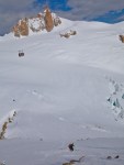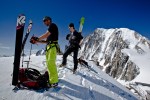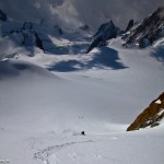 this is the top of the aiguille verte, on the top left you can see 3 skiers going up. they skied down the couturier (i saw 9 skiers that day going that way). on the right of the calotte, you can see helias millerious,tony lamiche, alex pittin getting involved in the Nant blanc face.