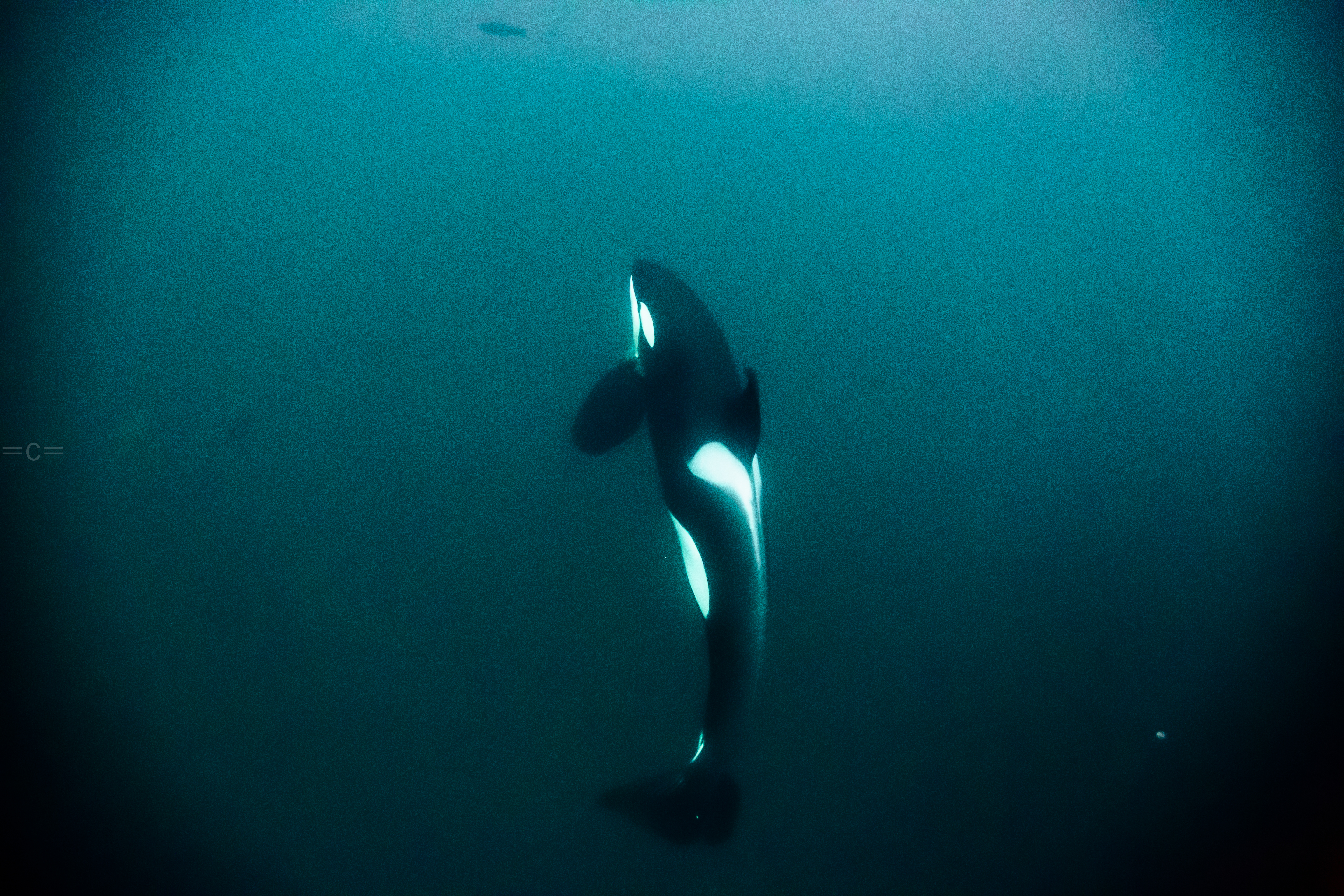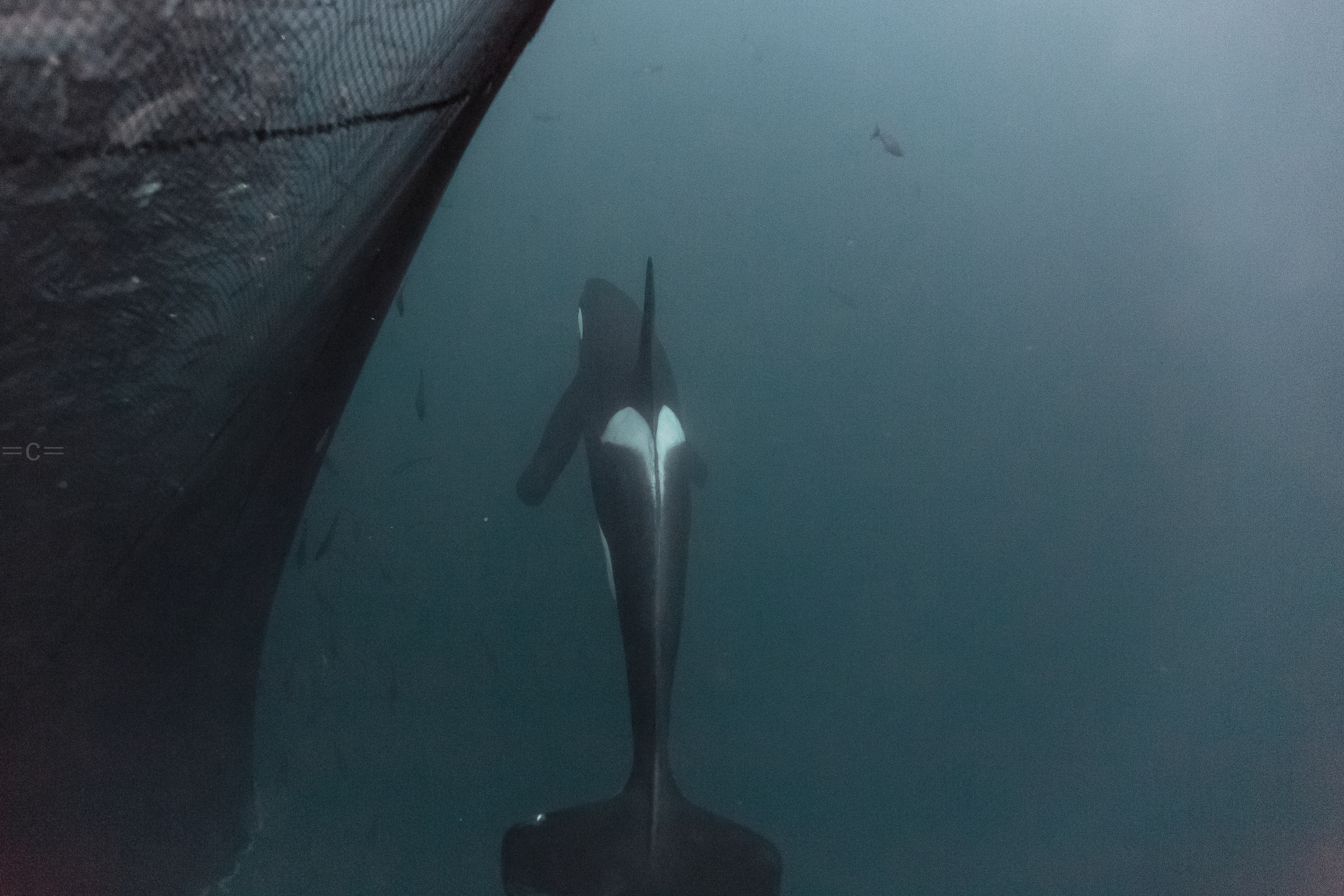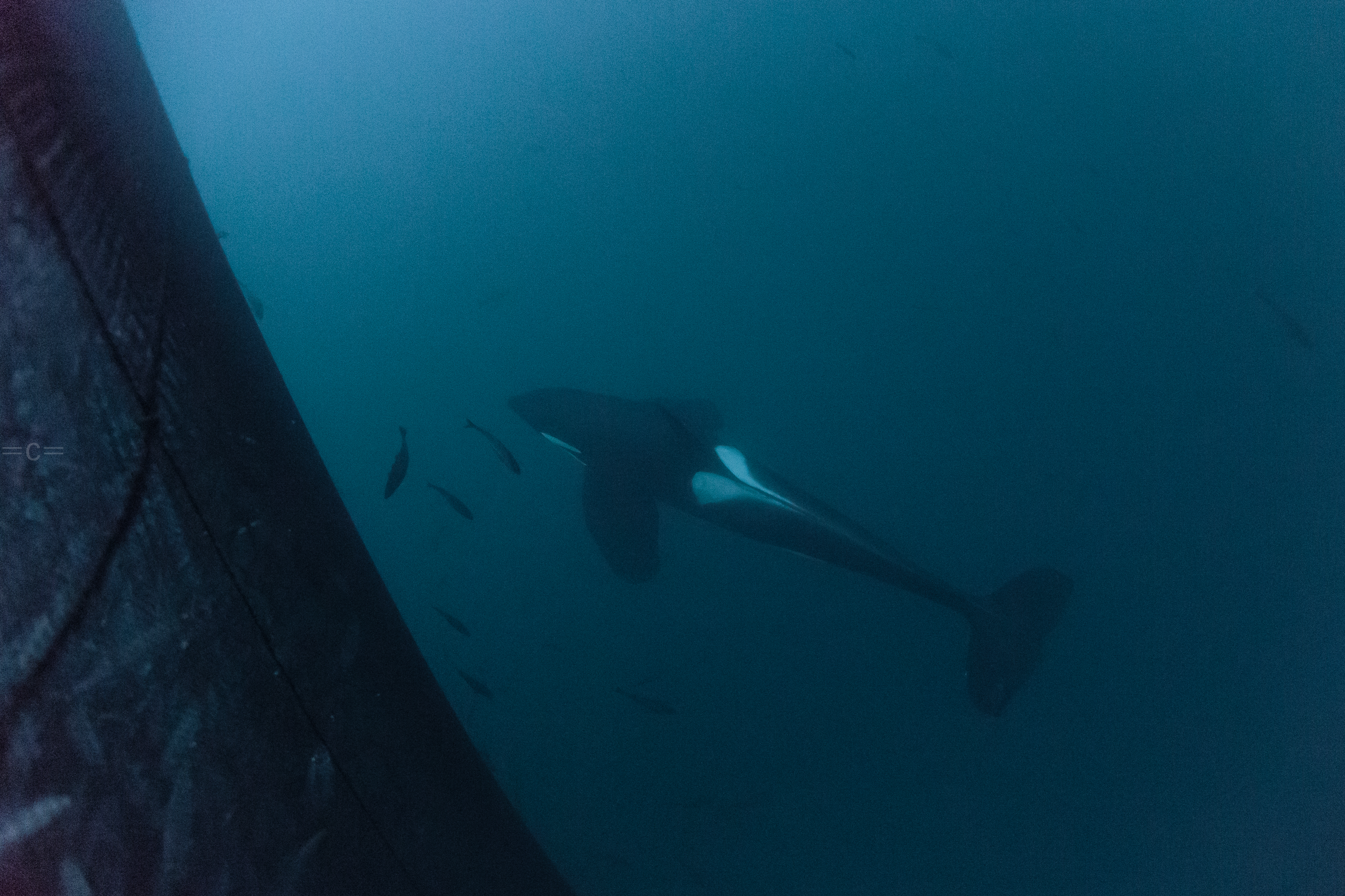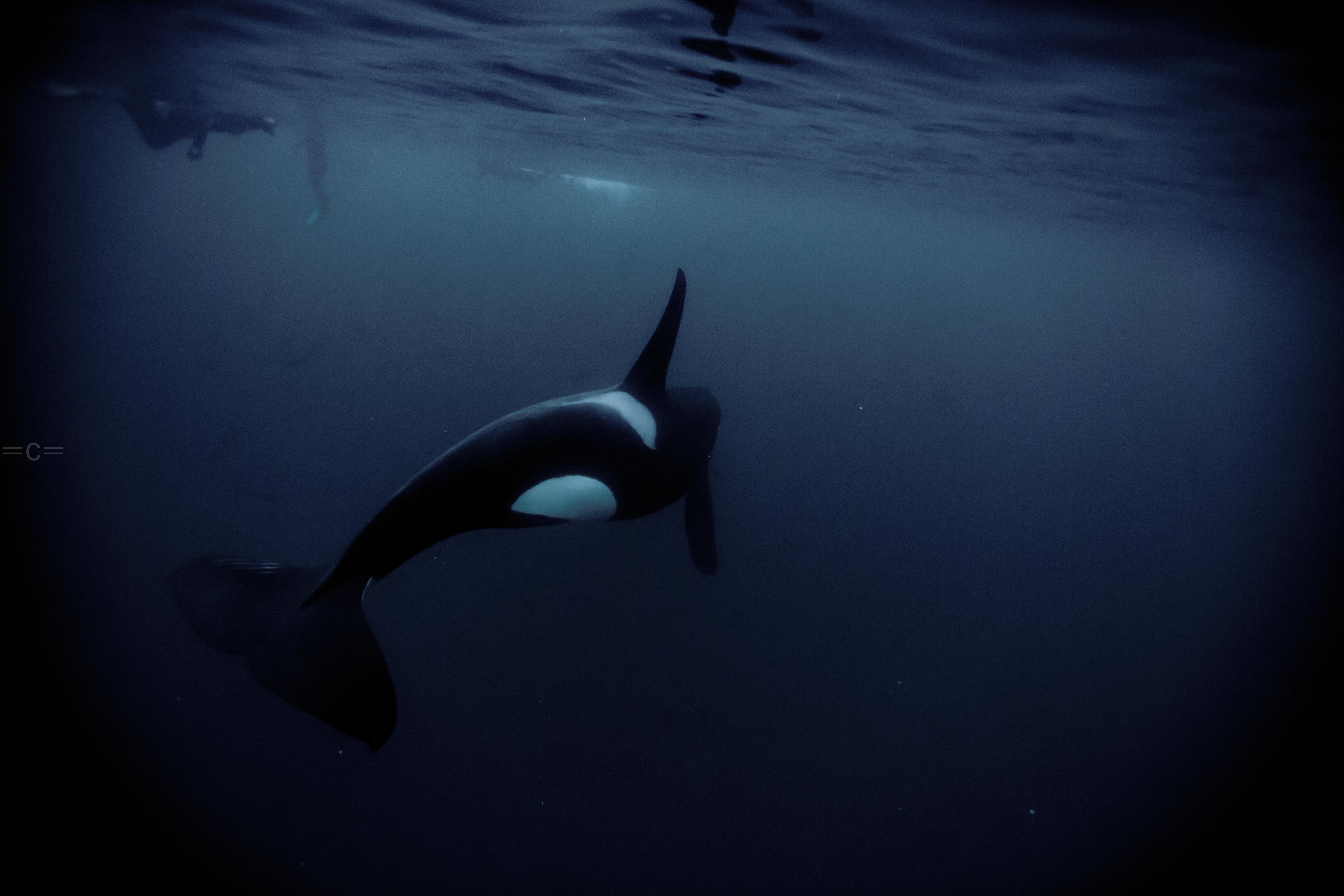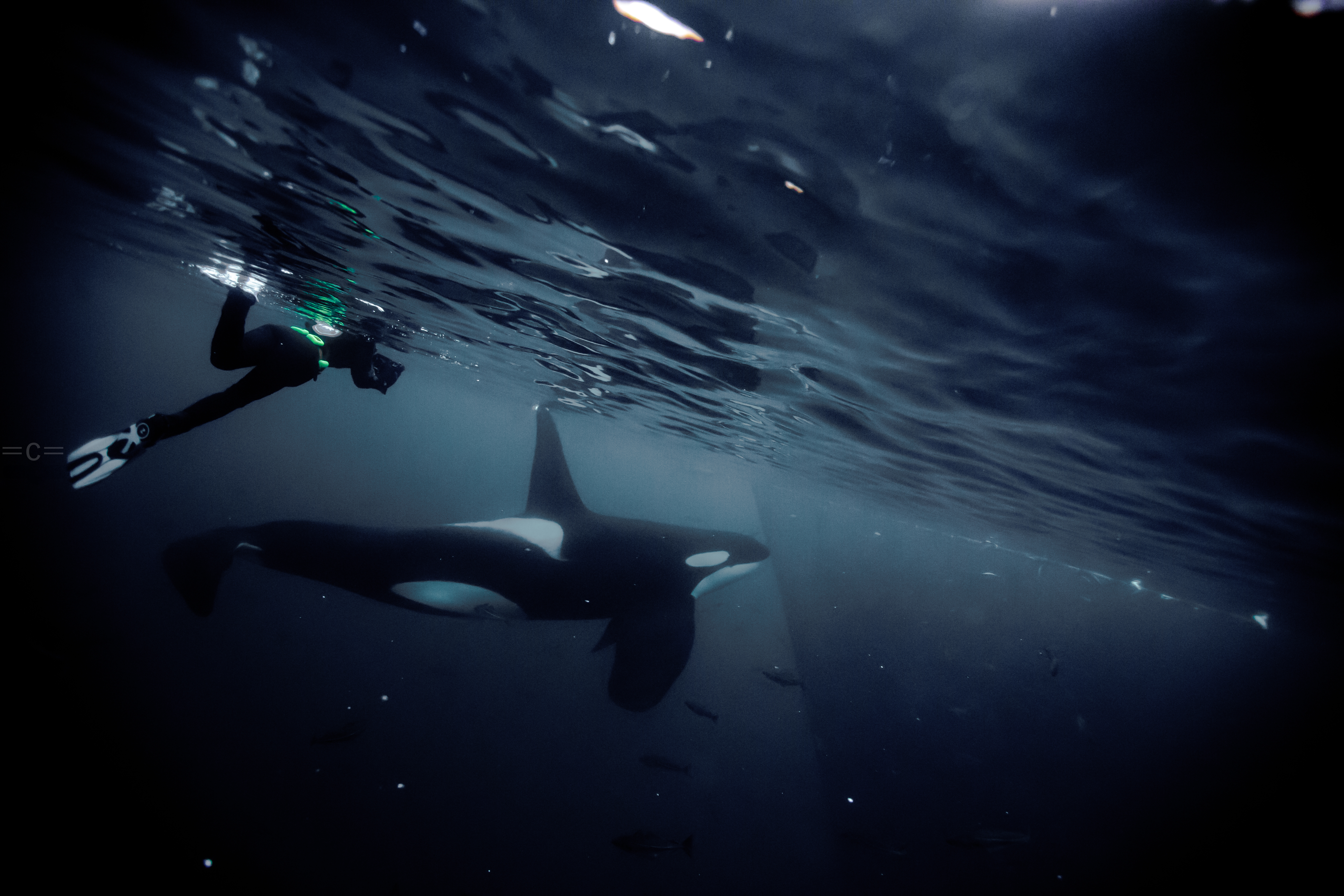 The orcas for the past 7 years had been in around Tromso, in the ervfjord. However, they follow the herrings. The water in ervfjord was 10c too warm, the salmond farm are depleting the water of oxygen and the herrings usually change location every 10 years or so, which one had them to move up north east to skervoy this year is unclear, but we had to move camp to Havness. we spent most our days on a boat, it took us 1 hour to go from Havnnes to Skervoy, once around skervoy, we were hoping to find them feeding on a ball bait of herring which makes it easy to take photos. When they are chasing salmond or just socializing, it is very difficult to get in the water on time before they vanish especially when they are not in the mood. Most the time we end up jumping in, maybe take a shot, back on boat, cold as hell, find a few other, jump in…and so on…