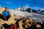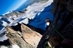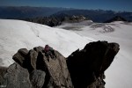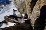 I had wonderful dreams for my heat wave-clear sky-no wind- days off. Some glorious summits. 2 of my favorites rope guns are having babies . The other one is in new york (why?) and my favorite climbing partner is in the midst of his mid thirties hormonal outburst. I have to be the rope gun then.that mean not so glorious summit nevertheless awesomeness… My first idea was the high up gorgeous ridge traverse on the aiguille doree. supposedly the best red granit in the mont blanc massif. however my new favorite rope bitch: Anna (that is her name) had to be at work on friday 5 pm at MBC. I chose the neighboring aiguille de purtscheller. Shorter and beautiful , high and far from the crowd. On the book it is pretty easy. the level is nice and sweet. I underestimated the chimney which was tough, long, no pros and required a few maneuvers to get the bags thru it and our bodies. other than that , RAS: beautiful climbing on amazing rock. The walk to and from is nothing less than amazing: Walking thru alpine meadows onto vast moraines, and then walk on those big glaciers (dark holes on the way) . The bivies around the albert 1 er hut are 5 stars….Everything went smoothly aside from a huge piece of rock smashing and ricochet over Anna’s body as she was raping . Luckily her backpack protected her. (panic attack for a few seconds thu) . she scored a few scratches and she made it on time at work. (Anna chose to not bring crampons err…!^$%@…better with). i am impressed at how she took it easy on the whole trip , she is soon to become a great climber…An alpinist.
