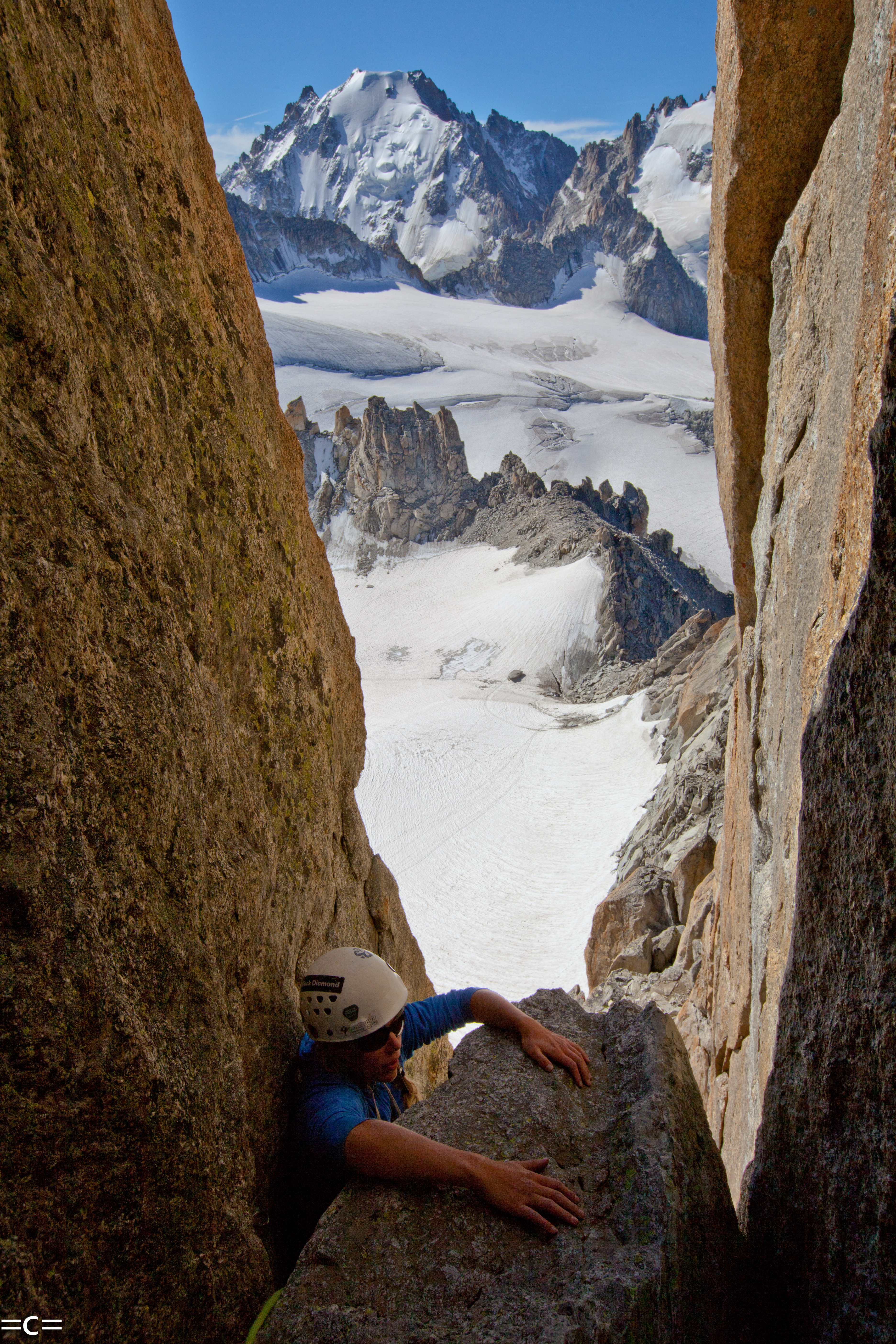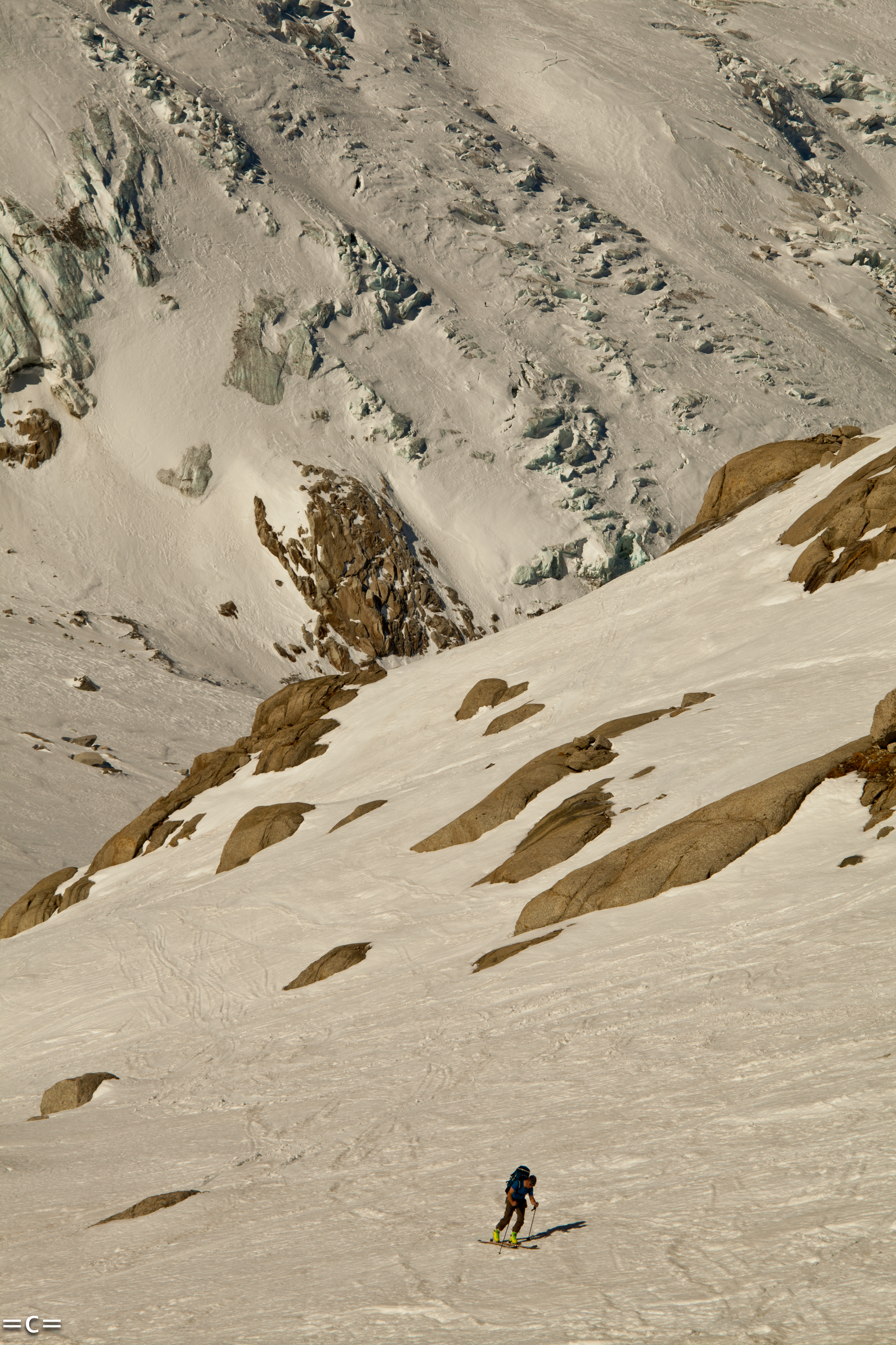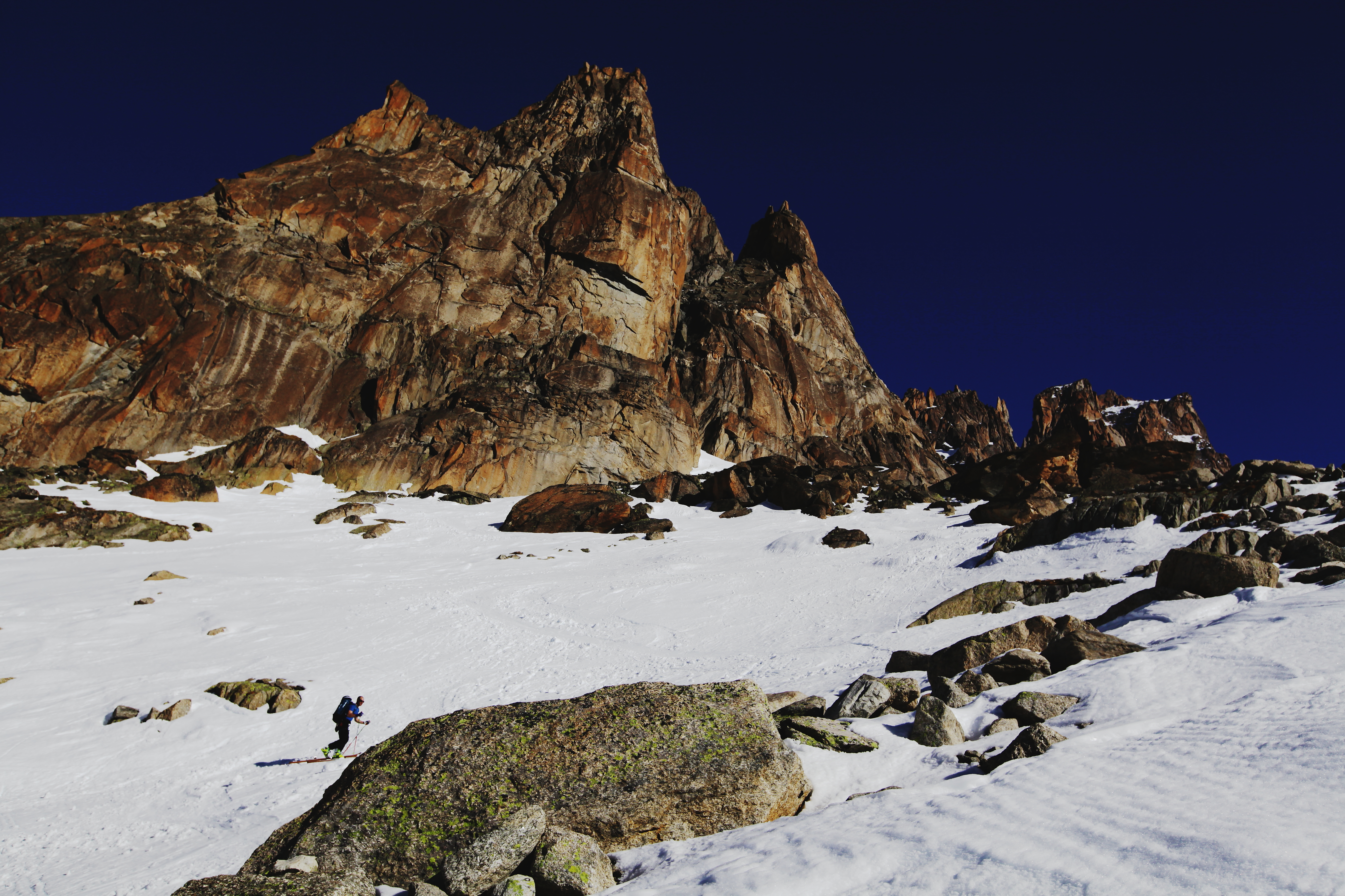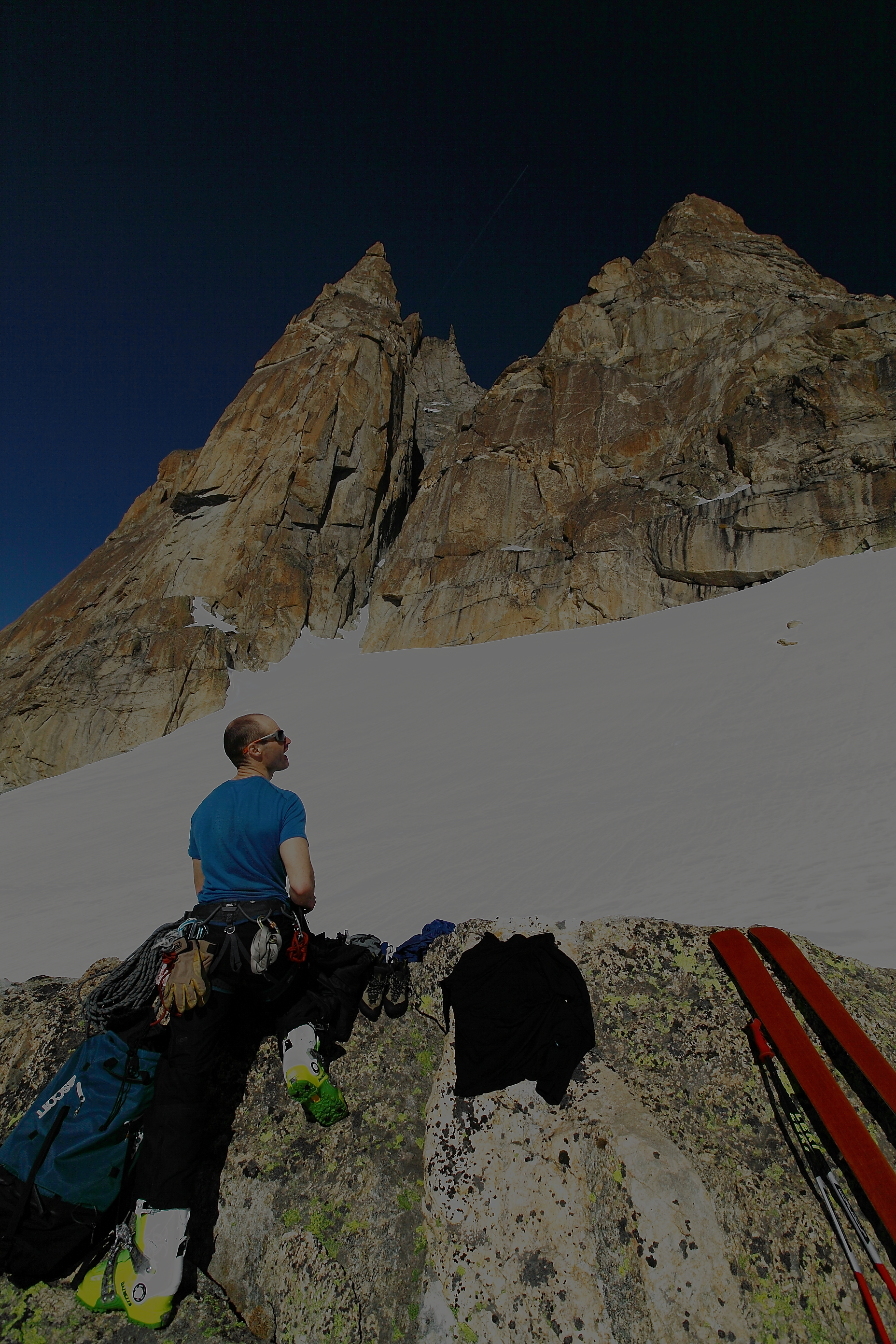 Every year at around spring which came a little too early this year , chamonix has my favorite kind of rock climbing: ski- in ski -out alpine rock climbing . you take a lift , ski 1000 meters -skin one hour-and you are at the base of beautiful south facing perfect alpine red granit towers. from 200M to 6ooM, from classic 5c to cutting edge 7c , splitters-face-you name it…you climb your route in the most beautiful alpine scenery , all day in the sun, rap , get back on your skis and glide down 2000 meters of beautiul rollers down the glacier to your car. that way you are avoiding the long heinous approach donkeying your gear around and the long descent. Only the best. just pleasure..the epitome of “joie de vivre”. Today we chose to go in the argentiere basin to climb the genepi south ridge. A perfect choice to start the season.