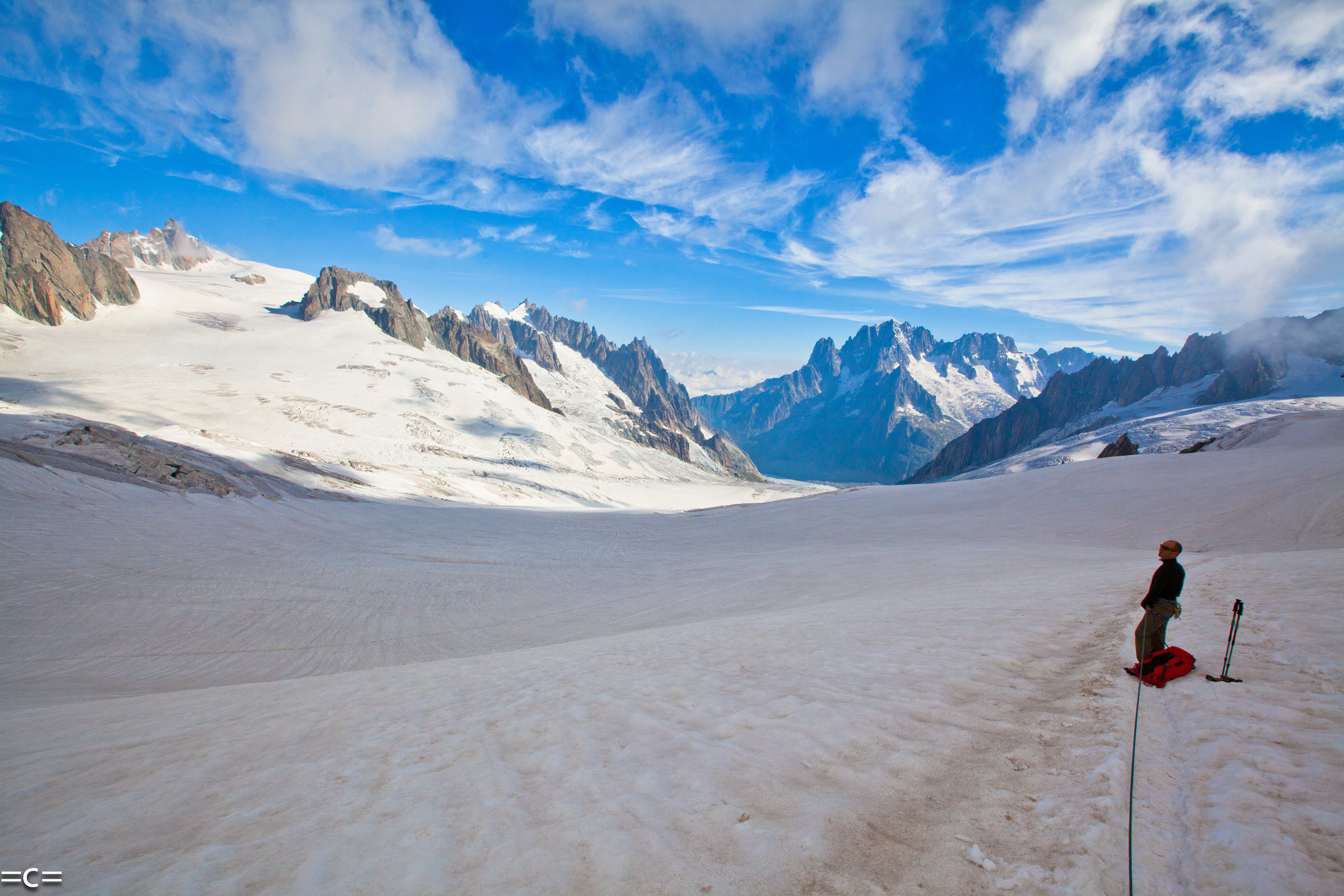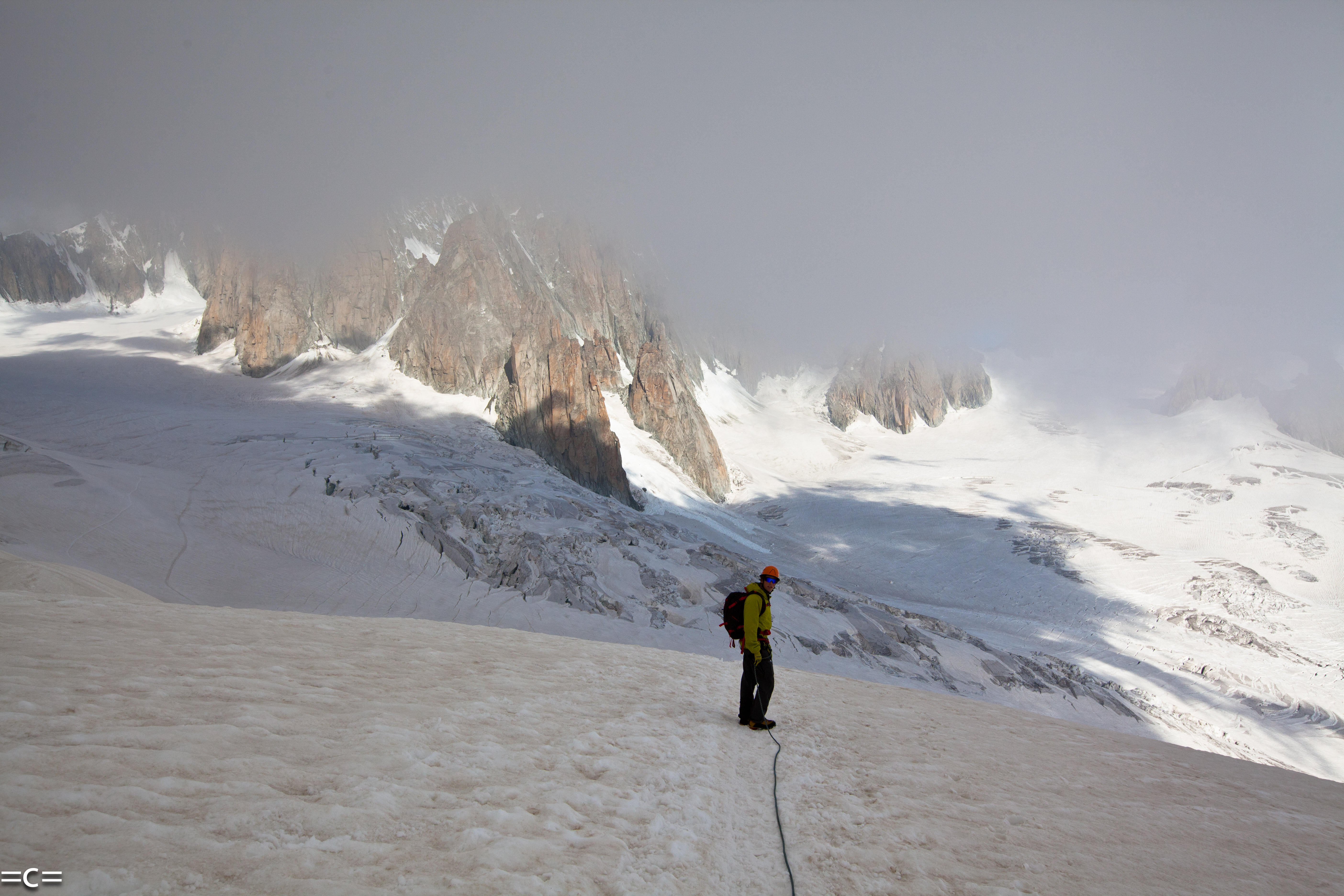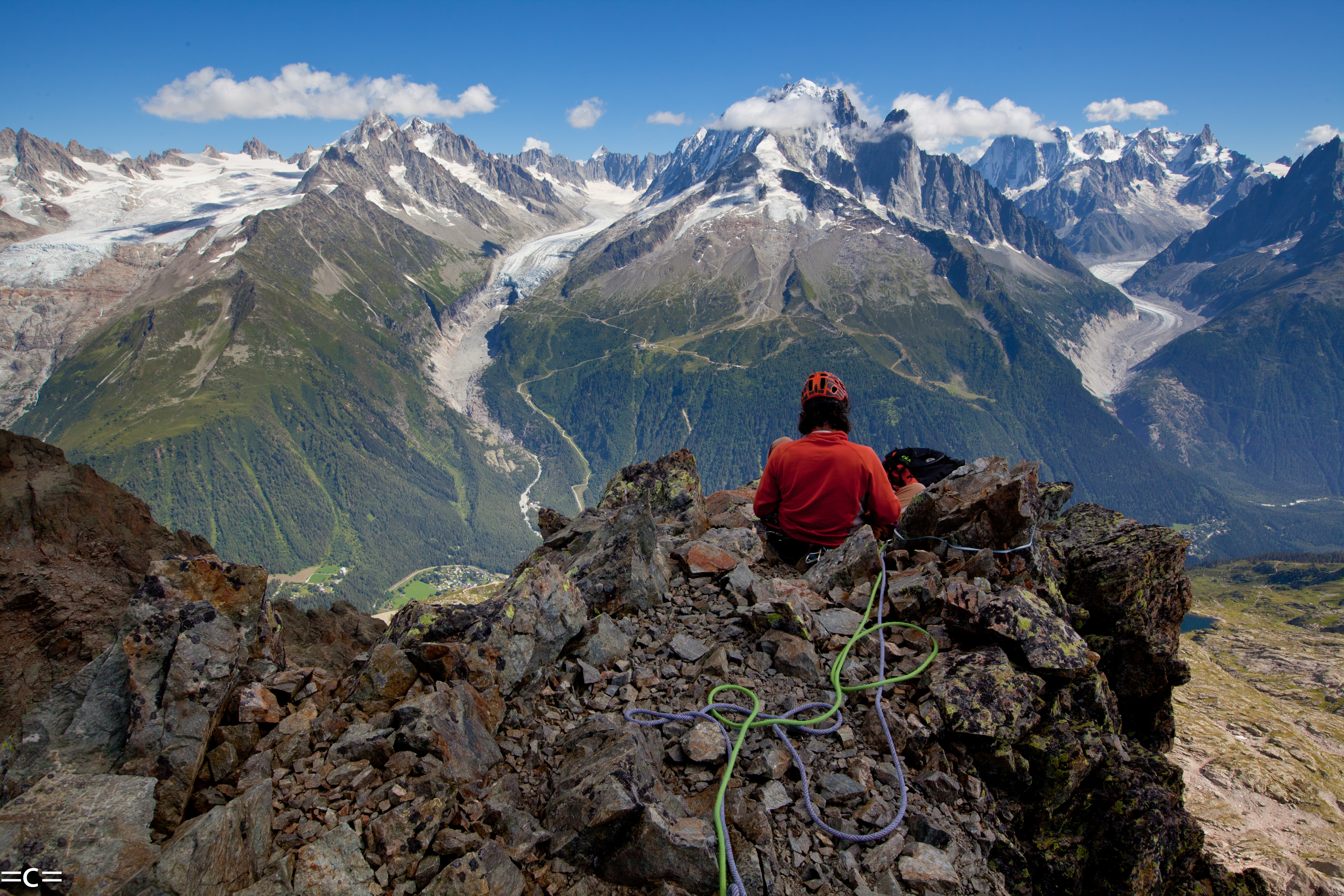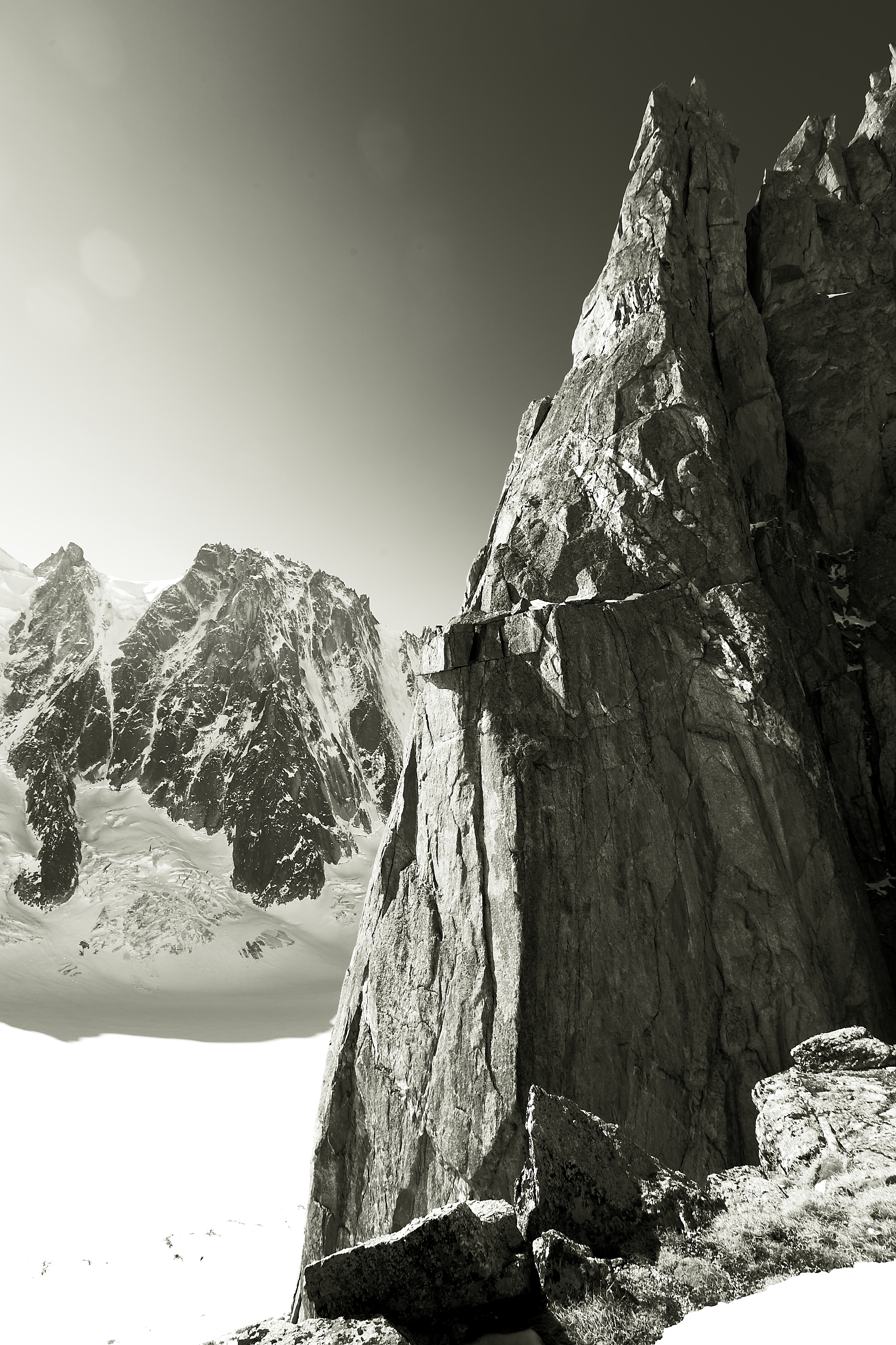 Every year at around spring which came a little too early this year , chamonix has my favorite kind of rock climbing: ski- in ski -out alpine rock climbing . you take a lift , ski 1000 meters -skin one hour-and you are at the base of beautiful south facing perfect alpine red granit towers. from 200M to 6ooM, from classic 5c to cutting edge 7c , splitters-face-you name it…you climb your route in the most beautiful alpine scenery , all day in the sun, rap , get back on your skis and glide down 2000 meters of beautiul rollers down the glacier to your car. that way you are avoiding the long heinous approach donkeying your gear around and the long descent. Only the best. just pleasure..the epitome of “joie de vivre”. Today we chose to go in the argentiere basin to climb the genepi south ridge. A perfect choice to start the season.