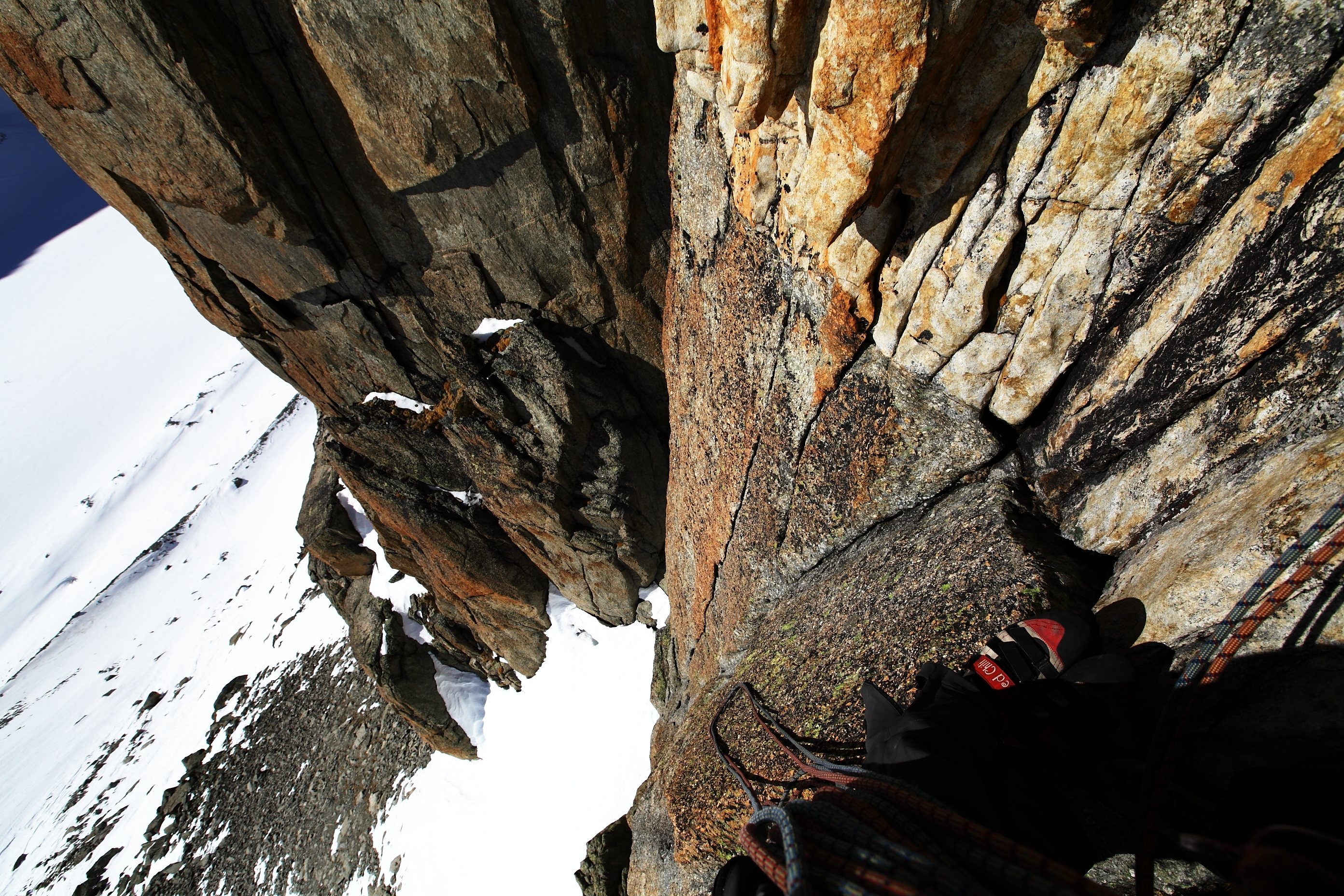 Ski in-ski out alpine red granit climbing just doesnt get any better than in the argentiere basin right now. take a lift, ski down, skin, climb beautiful high quality red granit and ski down at sunset with good corn along a beautiful glacier all the way to lognan . And if you time it right, you will get a freshly groomed soft “pierre a ric” down to your car. And that, was just delightful. About the climb: ok, , i suck at climbing so i rely a lot on beta and grading and dont waste a day . Espacially so in the argentiere basin where, in the summer, it takes you a minimum of 2 days to do any routes there . (one for the approach and the second for the climb and the descent). 2 days of sun in the summer on your days off is a hard one to get. i have been using a guide book for the past 2 years which was pretty good : the 6a max book. In that book they grade most of that route 4 with one 6a WRONG! totally wrong, FUCK that.FUCK them. i can somewhat lead 4’s…the entire route is sustain 5c dulfer (layback) with one biiig motha fucka 6a . those grades are the one in camptocamp.org. And I even think that some of the 5c were RUDE almost uncivilized. This is a beautiful climb with beautiful rock but goddamn! those laybacks i was cussing and coughing but having a lot of fun…Did I mention those delicates (read: scaaary) traverses?