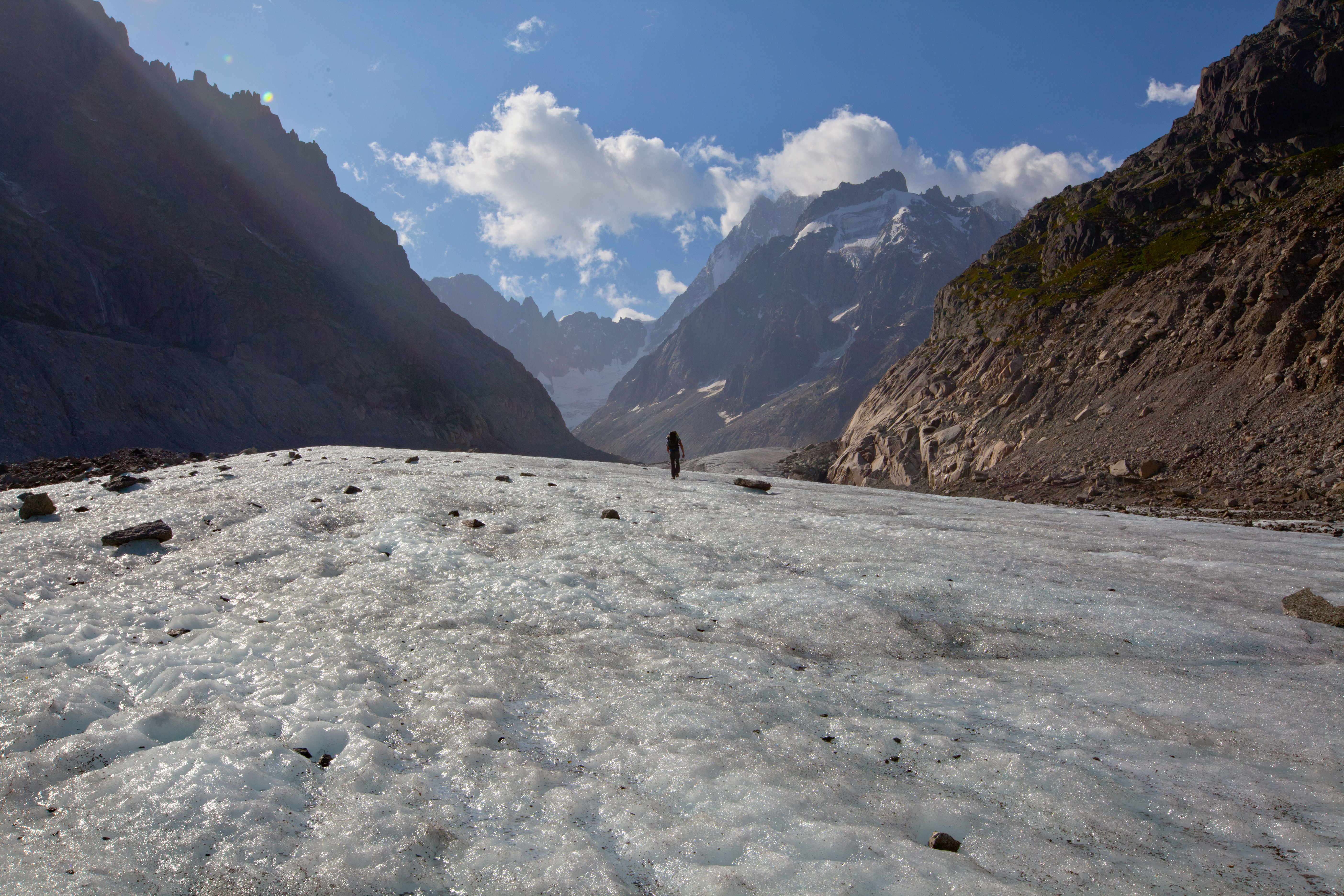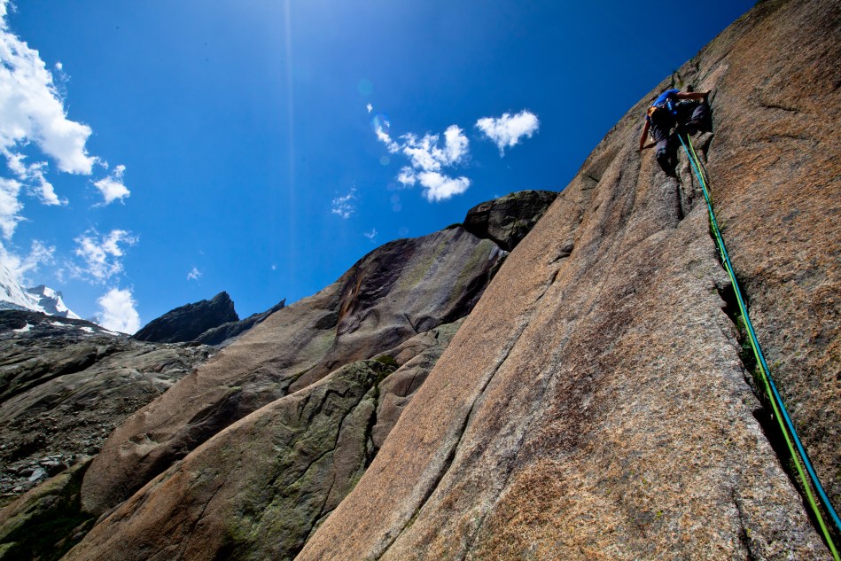 It is very luxurious to wake up-ride a train up 1000 meters and then walk on a sea of ice surrounded by huge mountains to the base of perfect granit crack and slab climbing. watch the moine crumble (hopefully noone was on the trail or climbing) and then walk back on the sea of ice, ride the train back to town and have a glass of wine at home.