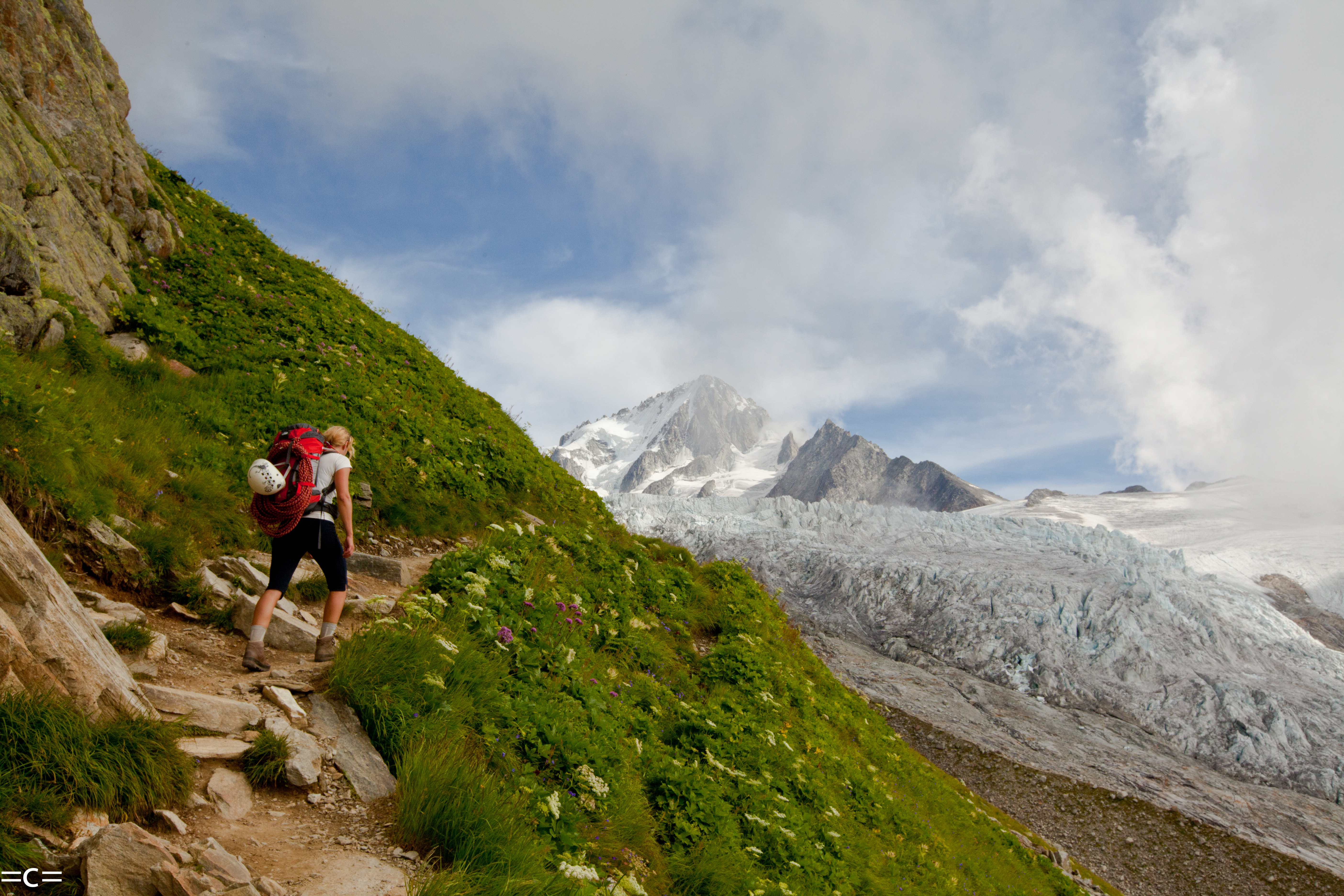 I had wonderful dreams for my heat wave-clear sky-no wind- days off. Some glorious summits. 2 of my favorites rope guns are having babies . The other one is in new york (why?) and my favorite climbing partner is in the midst of his mid thirties hormonal outburst. I have to be the rope gun then.that mean not so glorious summit nevertheless awesomeness… My first idea was the high up gorgeous ridge traverse on the aiguille doree. supposedly the best red granit in the mont blanc massif. however my new favorite rope bitch: Anna (that is her name) had to be at work on friday 5 pm at MBC. I chose the neighboring aiguille de purtscheller. Shorter and beautiful , high and far from the crowd. On the book it is pretty easy. the level is nice and sweet. I underestimated the chimney which was tough, long, no pros and required a few maneuvers to get the bags thru it and our bodies. other than that , RAS: beautiful climbing on amazing rock. The walk to and from is nothing less than amazing: Walking thru alpine meadows onto vast moraines, and then walk on those big glaciers (dark holes on the way) . The bivies around the albert 1 er hut are 5 stars….Everything went smoothly aside from a huge piece of rock smashing and ricochet over Anna’s body as she was raping . Luckily her backpack protected her. (panic attack for a few seconds thu) . she scored a few scratches and she made it on time at work. (Anna chose to not bring crampons err…!^$%@…better with). i am impressed at how she took it easy on the whole trip , she is soon to become a great climber…An alpinist.